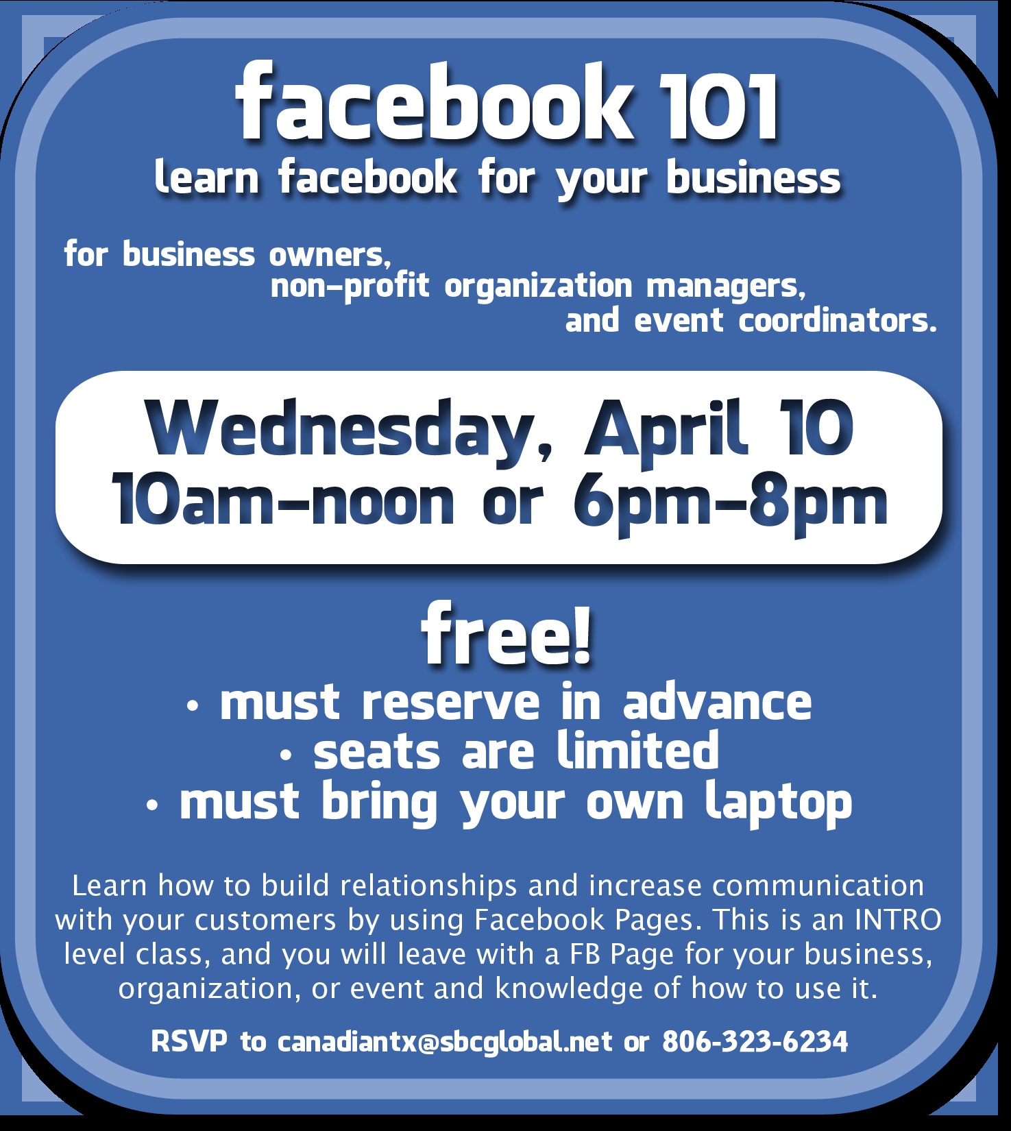 April 10 ~ Facebook Pages 101.  Pre-registration required.  806-323-6234.